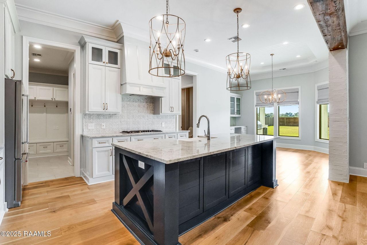 NEW WATER HEATER! Beautifully maintained and set in Flood Zone X, this stunning 4-bedroom, 3-bath home offers 2,609 sq. ft. of comfortable, farmhouse living. Built in 2018, it welcomes you with a spacious entry way, wood beams, NO CARPET, features a thoughtfully designed 3-way split floor plan & an open-concept kitchen & living area. The kitchen showcases slab countertops, custom cabinetry, a gas cooktop, designer fixtures, a walk-in pantry, & convenient under-island storage. Additional interior highlights include 9+ ft ceilings, a spacious dining area with wet bar, & a large laundry room equipped with storage and a utility sink.Step outside to enjoy an inviting covered patio complete with a wood-burning fireplace, sink, and refrigerator--ideal for outdoor gatherings and grilling year-round. The fully fenced backyard offers ample room for a pool and features an iron double-gate, providing easy access for a lawn mower, boat, or other outdoor equipment.You dont want to miss this! Schedule your showing today!